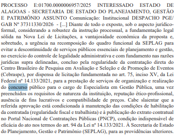 A decisão considerou aspectos como a reputação ético-profissional da banca, sua natureza sem fins lucrativos, a vantajosidade econômica e, sobretudo, a urgência na recomposição do quadro funcional da Seplag para evitar descontinuidade dos serviços públicos essenciais de planejamento e gestão.