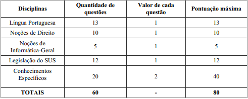 A prova objetiva abordará as disciplinas, número de questões e pontuação necessária para aprovação conforme quadro abaixo: