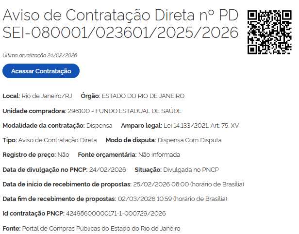 A banca organizadora do concurso SES RJ (Secretaria de Estado de Saúde do Rio de Janeiro) será definida no próximo dia 2 de março. O certame foi autorizado pelo governador Cláudio Castro em julho do ano passado.
