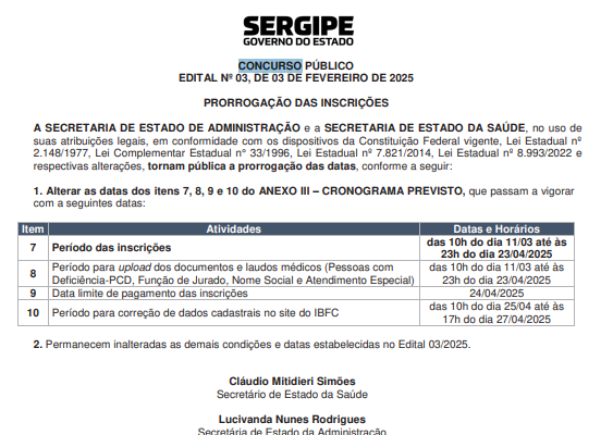 A prorrogação do período de inscrições foi divulgada por meio de edital publicado em Diário Oficial do estado nesta terça-feira (8/4). De acordo com o documento, as inscrições que seriam encerradas na próxima quarta-feira (9/4), foram prorrogadas até às 23h do dia 23 de abril de 2025, pelo site da banca IBFC.