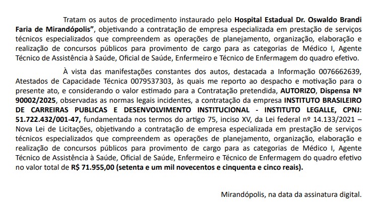 A Secretaria de Estado da Saúde de São Paulo (SES SP) deu mais um passo importante para a realização de um novo concurso público. Foi publicada no Portal Nacional de Contratações Públicas (PNCP), em 7 de outubro, a autorização para a contratação do Instituto Legalle como banca organizadora do certame, que visa preencher 17 vagas no Hospital Estadual Dr. Oswaldo Brandi Faria, localizado em Mirandópolis, no interior paulista.