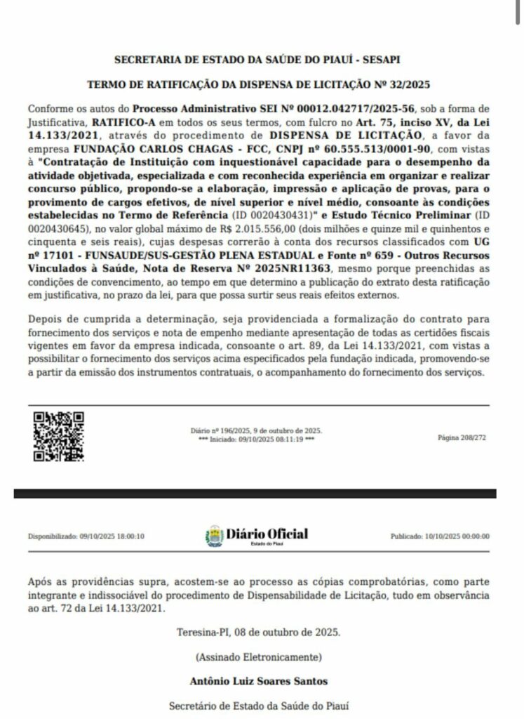 O termo de ratificação da dispensa de licitação foi publicado nesta quinta-feira (9/10), no Diário Oficial do Estado. Confira: