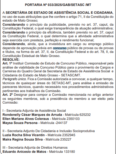 De acordo com o documento, o grupo será responsável pela análise de viabilidade de concurso público para o provimento de cargos e carreiras do quadro geral da SETASC MT.