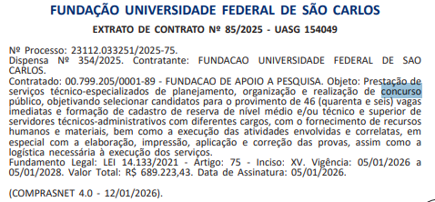 A Fundação Universidade Federal de São Carlos (UFSCar) formalizou a contratação da Fundação de Apoio à Pesquisa (FUNAPE) para organização de seu novo concurso público em São Paulo (SP).