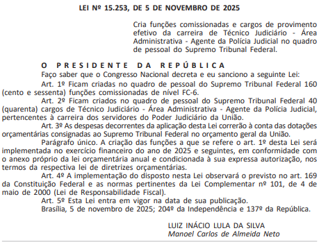 A mesma Lei nº 15.253 também criou 160 funções comissionadas de nível FC-6 no STF.