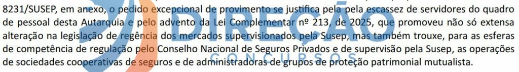 A Superintendência de Seguros Privados (SUSEP) enviou ao Ministério da Fazenda um pedido de autorização para o provimento excepcional de 97 candidatos aprovados no cadastro de reserva do último concurso, conforme apuração do Direção Concursos.