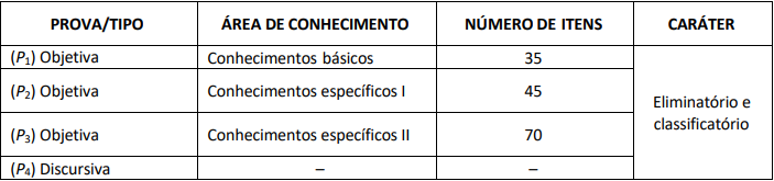 - Provas objetivas, de caráter eliminatório e classificatório; e