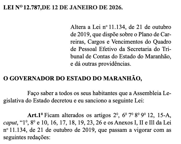 A nova legislação altera a Lei nº 11.134, de 21 de outubro de 2019, que estabelece o Plano de Carreiras, Cargos e Vencimentos do quadro de pessoal efetivo do TCE MA. O projeto, que tramitou rapidamente na Assembleia Legislativa do Maranhão (Alema), foi aprovado em dezembro de 2025.