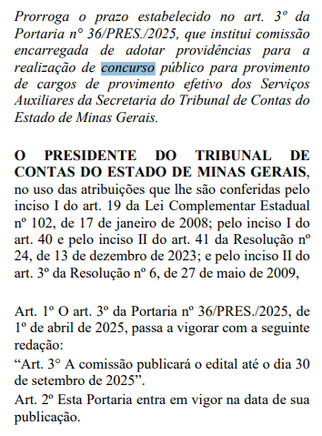 Foi prorrogado o prazo estabelecido para que a comissão organizadora do concurso TCE MG (Tribunal de Contas de Minas Gerais) publique o edital de abertura!