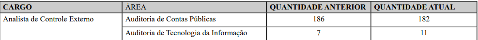 Já em relação à redistribuição de cargos, a resolução estabelece que fica alterada a área de atividade de 4 (quatro) cargos de Analista de Controle Externo, passando da área de Auditoria de Contas Públicas para a área de Auditoria de Tecnologia da Informação, conforme o quadro abaixo: