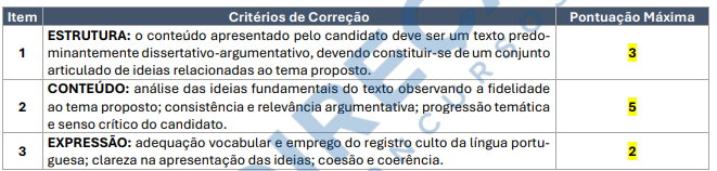 Os critérios de correção da Prova Discursiva serão conforme a tabela a seguir: