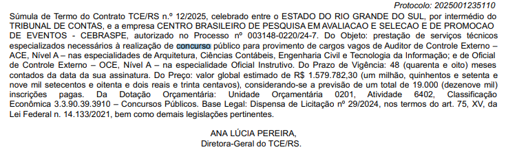 Isso porque foi publicada em Diário Oficial do estado nesta sexta-feira (21/3), a súmula de termo do contrato, que oficializa o Cebraspe como banca organizadora do certame.