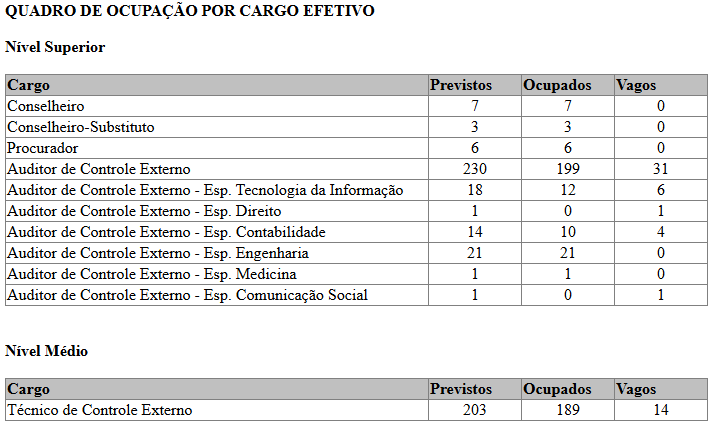 De acordo com dados extraídos do portal da transparência do TCM RJ, o Tribunal possui atualmente 57 cargos efetivos vagos em seu quadro.