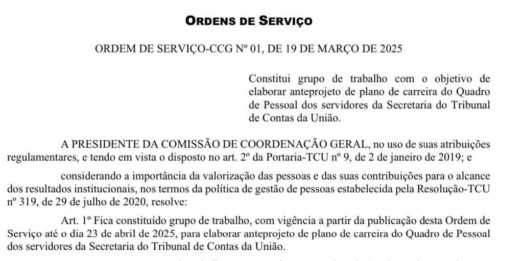 O ato de serviço foi publicado na última quinta-feira (19) no portal oficial de notícias do órgão, BTCU. O documento expõe que o grupo terá até o dia 23 de abril de 2025 para elaborar o anteprojeto de lei de plano de carreira do Quadro de Pessoal dos servidores da Secretaria do Tribunal de Contas da União.