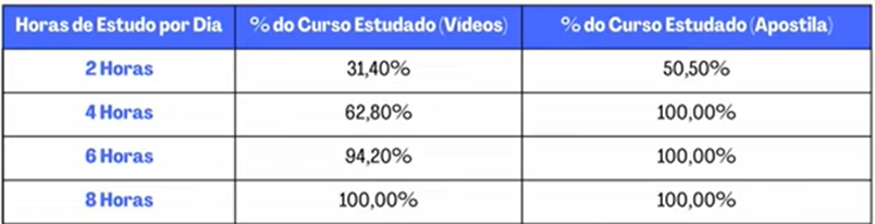 Estudando apenas por videoaula, o processo seria um pouco mais prolongado e o candidato precisaria de 8 horas de estudos por dia para estudar 100% do conteúdo.