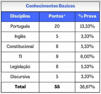 Serão 50 questões de conhecimentos básico e 70 questões de conhecimentos específicos, valendo um ponto cada uma. No entanto, o edital não detalha quantas questões serão cobradas em cada uma das disciplinas.