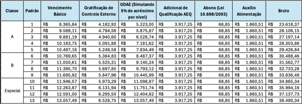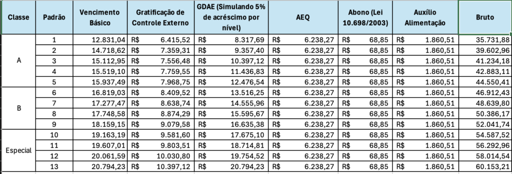 A Gratificação de Desempenho e Alinhamento Estratégico (GDAE) varia entre 40% e 100% sobre o maior vencimento básico do cargo, sendo paga no mínimo em 40% até regulamentação específica do TCU.