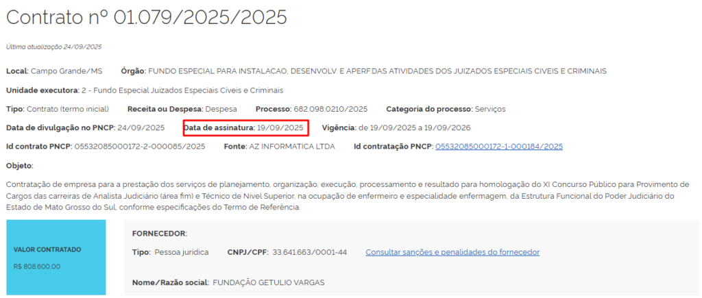De acordo com o termo inicial de contrato publicado no Portal Nacional de Contratações Públicas na última quarta-feira (24/9), o contrato com a banca Fundação Getúlio Vargas (FGV) foi assinado no último 19 de setembro e seguirá vigente até setembro de 2026.