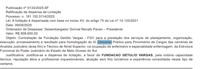 A Fundação Getúlio Vargas (FGV) foi oficialmente confirmada como a banca organizadora do concurso do Tribunal de Justiça de Mato Grosso do Sul (TJ MS). A ratificação da dispensa de licitação foi publicada em Diário Oficial Judiciário nesta sexta-feira (12/9), consolidando a escolha já anunciada pelo presidente do TJ MS, Dorival Renato Pavan.