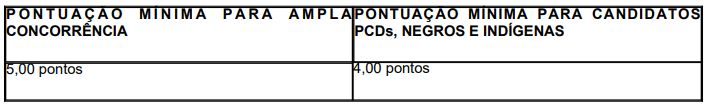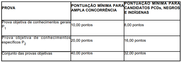 A nota em cada prova objetiva será igual à soma das notas obtidas em todos os itens que a compõem. Será reprovado nas provas objetivas e eliminado do concurso público o candidato que não alcançar a pontuação mínima, conforme descrito no quadro a seguir:
