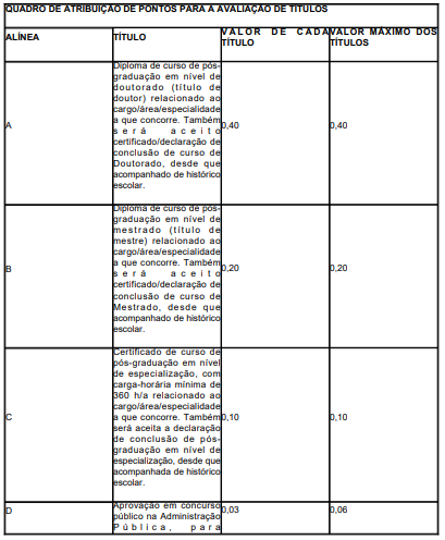 A avaliação de títulos valerá 1,00 pontos, ainda que a soma dos valores dos títulos apresentados seja superior a esse valor.