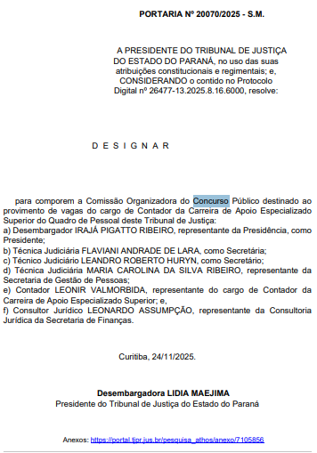 O Tribunal de Justiça do Estado do Paraná (TJ PR) deu mais um passo em direção à realização do concurso Público para o cargo de Contador. Nesta quinta-feira (27/11), foi publicada no Diário Judiciário a Portaria nº 200702025, que formaliza a criação da Comissão Organizadora responsável pela seleção.