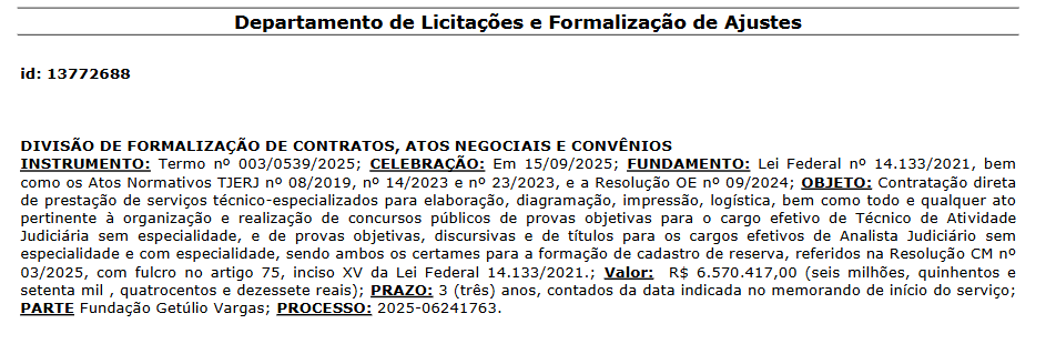 O termo de contrato entre a Fundação Getúlio Vargas (FGV) e o Tribunal de Justiça do Rio de Janeiro foi publicado em Diário da Justiça Eletrônico nesta terça-feira, 16 de setembro. De acordo com o documento, o contrato foi assinado na última segunda-feira (15/9) e seguirá vigente por três anos.