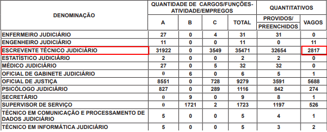 A lista com base em dezembro de 2024 foi publicada em Diário da Justiça nesta quarta-feira (16/4) e aponta um total de 13.449 cargos vagos. Destes, 2.817 são referentes ao cargo de Escrevente Técnico Judiciário, como é possível ver no trecho abaixo: