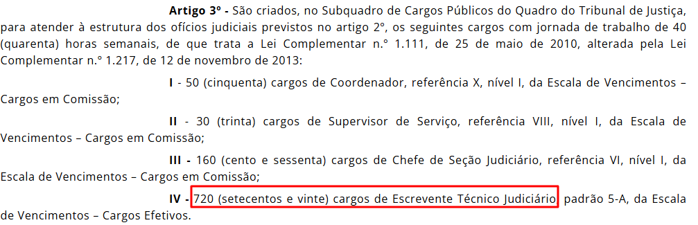 Dos cargos criados, 720 são para Escrevente Técnico Judiciário, como é possível ver no trecho abaixo: