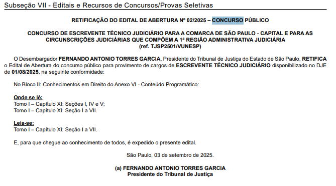 A retificação, publicada em Diário Judiciário nesta sexta-feira, 5 de setembro, traz alteração em relação ao conteúdo programático de Normas da Corregedoria.