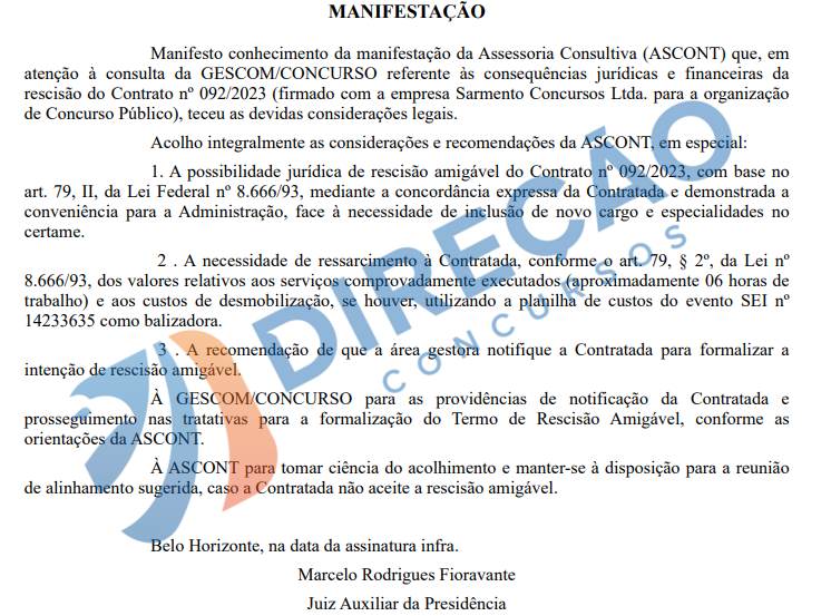 O Tribunal de Justiça de Minas Gerais (TJMG) divulgou uma manifestação oficial sobre o Contrato nº 092/2023, firmado com a empresa Sarmento Concursos Ltda. (também conhecida por MS Concursos), que seria responsável pela organização do concurso público. De acordo com o documento, foi determinada a rescisão amigável do contrato, e um novo edital não está nos planos do tribunal no momento.