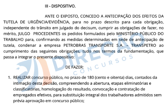Em caso de descumprimento das obrigações, como a realização do concurso Transpetro, ficou fixada multa diária de R$ 10 mil por trabalhador mantido ou contratado irregularmente. Veja a decisão abaixo: