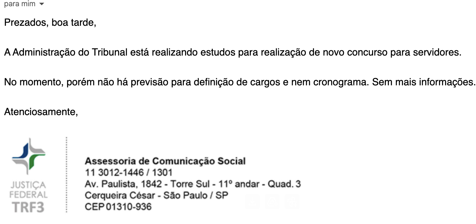As informações foram confirmadas pela Administração do tribunal, em contato com o Direção. Segundo o órgão, os estudos seguem em andamento e novas informações serão divulgadas oportunamente. Ainda não há definição de cargos nem cronograma estabelecido para o certame.