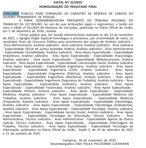 Com a homologação, o TRT 15 conclui a fase administrativa do concurso. Agora, a administração do Tribunal está formalmente autorizada a começar a convocar os aprovados dentro das vagas do cadastro de reserva, de acordo com a disponibilidade orçamentária e as necessidades da instituição.