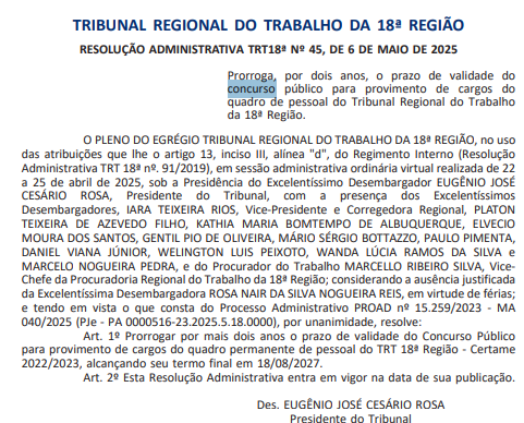 O último edital do concurso TRT GO (Tribunal Regional do Trabalho da 18ª região – Goiás) teve a validade prorrogada por mais 2 anos!