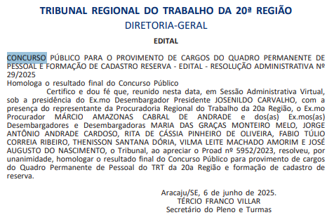O resultado final do concurso TRT SE (Tribunal Regional do Trabalho da 20ª Região – Sergipe) foi homologado!