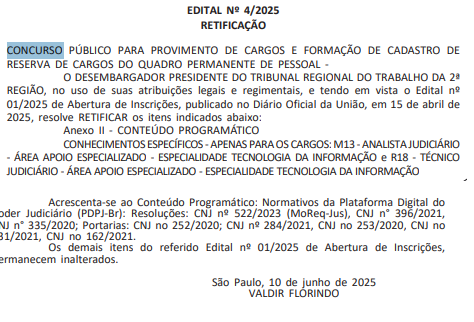 O edital do concurso TRT SP (Tribunal Regional do Trabalho da 2ª Região – São Paulo) passou por uma nova retificação!O documento, publicado em Diário Oficial da União nesta quarta-feira (11/6), traz alteração em relação ao conteúdo programático referente aos conhecimentos específicos dos cargos de Analista Judiciário – Tecnologia da Informação e Técnico Judiciário – Tecnologia da Informação.Acrescenta-se ao conteúdo programático: Normativos da Plataforma Digital do Poder Judiciário (PDPJ-Br): Resoluções: CNJ nº 522/2023 (MoReq-Jus), CNJ n° 396/2021, CNJ n° 335/2020; Portarias: CNJ no 252/2020; CNJ nº 284/2021, CNJ no 253/2020, CNJ no 131/2021, CNJ no 162/2021.Os demais itens do referido edital permanecem inalterados.O concurso TRT SP oferta 2 vagas imediatas, além de oportunidades em cadastro reserva para Analista e Técnico Judiciário, em diversas especialidades. O salário inicial é de até R$ R$ 17.018,67.Confira, abaixo, a retificação na íntegra:Para auxiliar sua trajetória pós-edital, o Direção Concursos preparou um edital verticalizado totalmente GRATUITO para turbinar seus estudos!O material contém o conteúdo programático completo que você precisa estudar, focado no cargos de Analista Judiciário – Área Administrativa, Analista Judiciário – Área Judiciária e todas as especialidades de Técnico Judiciário do Tribunal Regional do Trabalho de São Paulo.Clique no botão abaixo para garantir seu material e sair na frente da concorrência: QUERO MEU EDITAL VERTICALIZADO DO CONCURSO TRT SP!Panorama do concurso TRT SPOrganizado pela FCC, o concurso TRT SP oferta 2 vagas imediatas, além de oportunidades em cadastro reserva para Analista e Técnico Judiciário, em diversas especialidades. O salário inicial é de até R$ R$ 17.018,67.Confira, abaixo, a distribuição das vagas:Técnico JudiciárioTécnico Judiciário – Área Administrativa – Sem Especialidade: CRTécnico Judiciário – Área Administrativa – Agente da Polícia Judicial: CRTécnico Judiciário – Área Apoio Especializado – Tecnologia da Informação: 1 vaga + CR.Analista JudiciárioAnalista Judiciário – Área Judiciária – Sem Especialidade: CRAnalista Judiciário – Área Judiciária – Oficial de Justiça e Avaliador Federal: CRAnalista Judiciário – Área Administrativa – Sem Especialidade: CRAnalista Judiciário – Área Administrativa – Contabilidade: CRAnalista Judiciário – Área Apoio Especializado – Engenharia Civil: CRAnalista Judiciário – Área Apoio Especializado – Engenharia Elétrica: CRAnalista Judiciário – Área Apoio Especializado – Engenharia Mecânica: CRAnalista Judiciário – Área Apoio Especializado – Engenharia Segurança do Trabalho: CRAnalista Judiciário – Área Apoio Especializado – Estatística: CRAnalista Judiciário – Área Apoio Especializado – Medicina (Cardiologia): CRAnalista Judiciário – Área Apoio Especializado – Medicina (Clínico Geral): CRAnalista Judiciário – Área Apoio Especializado – Medicina do Trabalho: CRAnalista Judiciário – Área Apoio Especializado – Medicina (Psiquiatria): CRAnalista Judiciário – Área Apoio Especializado – Serviço Social: CRAnalista Judiciário – Área Apoio Especializado – Tecnologia da Informação: 1 vaga + CROs candidatos serão avaliados por meio das etapas seguintes:Provas objetivas, de caráter eliminatório e classificatório, para todos os cargos;Prova discursiva, de caráter eliminatório e classificatório, para todos os cargos;Teste de aptidão física, de caráter eliminatório, somente para o cargo de Técnico Judiciário – Área Administrativa – Especialidade: Agente da Polícia Judicial.As provas objetivas e dicursiva serão aplicadas em São Paulo/SP , no dia 3 de agosto de 2025, nos turnos seguintes:Manhã: para os cargos de Analista Judiciário, todas as áreas/especialidades;Tarde: para os cargos de Técnico Judiciário, todas as áreas/especialidades.O Direção possui um canal exclusivo para envio de notícias no WhatsApp! Além de todas as novidades do mundo dos concursos, lá você encontra e-books e outros materiais gratuitos, cupons EXCLUSIVOS de desconto, aulas GRATUITAS e muito mais.Não perca tempo e entre agora!ENTRE AGORA NO CANAL DE NOTÍCIAS!ResumoBanca: FCCVagas: 2 + CRCargos: Analista e Técnico JudiciárioSalários: até R$ 17.018,67Escolaridade: nível superiorInscrições: 24/4 a 26/5Taxa:Analista: R$ 110,00Técnico: R$ 90,00Provas: 3/8/2025EditalVocês pediram, nós atendemos! Agora, vocês podem TESTAR gratuitamente a assinatura do Direção Concursos e COMPROVAR a qualidade dos nossos cursos. Inscreva-se agora mesmo e aproveite!Ps: são poucas vagas. Então, aproveite!!Clique abaixo e não perca: