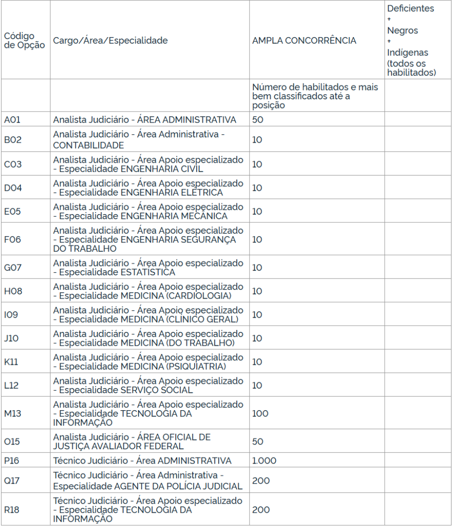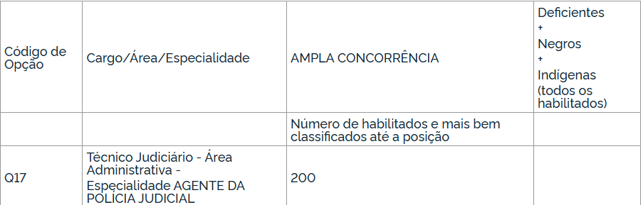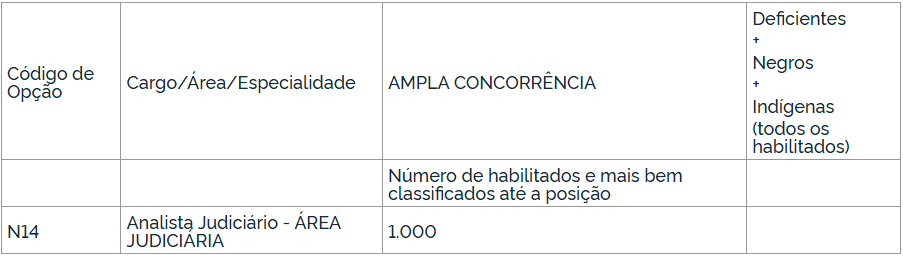 Serão corrigidas as Provas Discursivas – Estudos de Caso dos candidatos para Analista Judiciário – ÁREA JUDICIÁRIA habilitados e mais bem classificados na Prova Objetiva considerados os empates na última posição de classificação até o limite estabelecido no quadro a seguir, mais todos os candidatos com deficiência habilitados e, também, todos os candidatos autodeclarados negros e/ou indígenas habilitados: