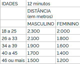 O mínimo habilitatório para esta prova, dentro do tempo de 12 minutos, encontra-se na tabela abaixo:
