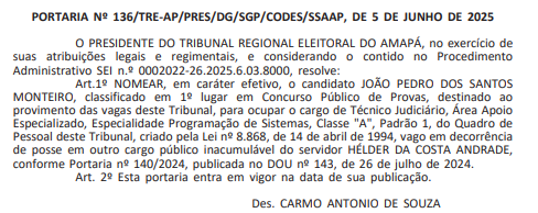 Foi publicada em Diário Oficial da União nesta segunda-feira (9/6), portaria informando a nomeação de aprovado em 1° lugar para o cargo de Técnico Judiciário – Área Apoio Especializado – Especialidade: Programação de Sistemas, no Tribunal Regional Eleitoral do Amapá (TRE AP).