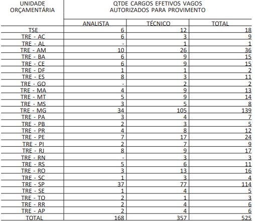 A portaria do Tribunal Superior Eleitoral (TSE) autorizou o provimento de 168 cargos de Analista e 357 cargos de Técnico, totalizando 525 cargos para o próprio TSE e para diversos Tribunais Regionais Eleitorais.