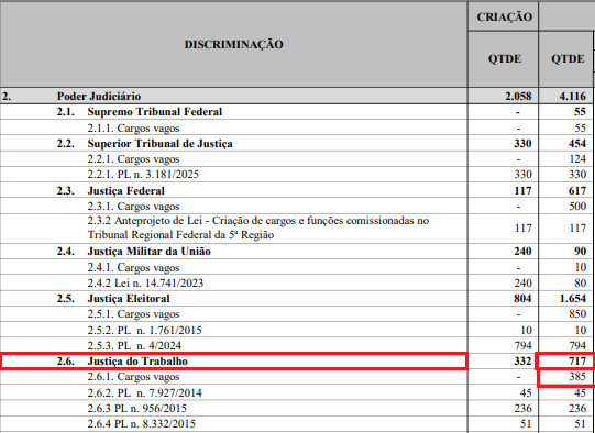 O Projeto de Lei Orçamentária Anual (PLOA) para 2026, enviado ao Congresso Nacional em 29 de agosto, inclui a previsão de provimento de 717 cargos para a Justiça do Trabalho. Desse total, 385 são para preencher vagas já existentes (cargos vagos). A proposta é o primeiro passo formal para que tribunais, como o TST e os TRTs, possam convocar aprovados de certames antigos ou realizar novos concursos.