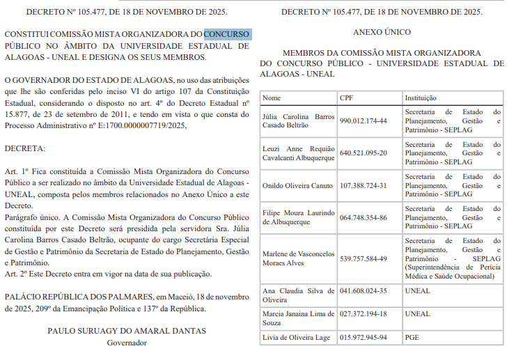 Foi publicada nesta quarta-feira (19/11), em Diário Oficial do estado de Alagoas, a portaria que institui a Comissão Mista Organizadora do Concurso Público da Universidade Estadual de Alagoas (UNEAL). O decreto nº 105.477 formaliza a criação do grupo responsável por conduzir os trabalhos do certame, que ofertará 82 vagas para o cargo de Analista Administrativo.