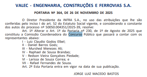 A Valec Engenharia, Construções e Ferrovias S.A (Infra S.A), por meio da Portaria nº 364, publicada em Diário Oficial da União nesta sexta-feira (28/11), alterou a composição da Comissão Coordenadora do seu novo concurso público.
