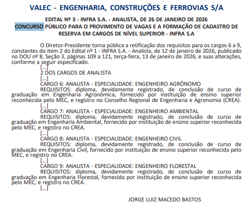 A Valec Engenharia, Construções e Ferrovias S/A publicou nesta terça-feira (27/1) uma retificação no edital do concurso público para o cargo de Analista.