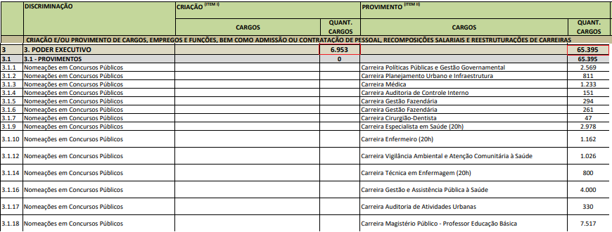Foi autorizada a nomeação de 65.395 cargos no Poder Executivo, com um impacto financeiro para esse exercício na ordem de R$ 9,7 bilhões. Para o caso de criação de novos cargos, o anexo IV da LDO 2026 autoriza a criação de até 6.953 cargos, com um impacto orçamentário-financeiro de aproximadamente R$ 400 milhões.