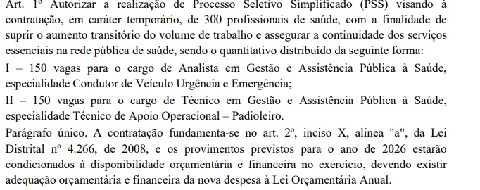 A Secretaria de Saúde do Distrito Federal autorizou a realização de Processo Seletivo Simplificado (PSS) para contratação temporária de 300 profissionais de saúde. O objetivo é suprir o aumento transitório do volume de trabalho e assegurar a continuidade dos serviços essenciais na rede pública de saúde.As 300 vagas estão distribuídas em duas especialidades:Analista em Gestão e Assistência Pública à Saúde – Condutor de Veículo Urgência e Emergência:150 vagas para profissionais que atuarão na condução de veículos de urgência e emergência no sistema de saúde.Técnico em Gestão e Assistência Pública à Saúde – Técnico de Apoio Operacional (Padioleiro):150 vagas para técnicos que exercerão funções operacionais de apoio, incluindo o transporte de pacientes em macas e padiolas.Além das 300 vagas imediatas, foi autorizada a previsão de cadastro de reserva de 300 vagas para cada uma das duas especialidades, totalizando 600 vagas reserva. Essa previsão segue estimativa de impacto orçamentário-financeiro que consta nos autos do processo.A autorização foi divulgada em Diário Oficial nesta terça-feira (3/2), confira:Está começando seus estudos? O Direção concursos preparou um Manual Básico do Iniciante de Concursos Públicos para você dar seu primeiro passo para aprovação. Nele, você vai encontrar os termos, os conceitos, as áreas de estudo e tudo o que você precisa saber! Adquira o material gratuito. O Direção concursos preparou um Manual Básico do Iniciante de Concursos Públicos para você dar seu primeiro passo para aprovação. Nele, você vai encontrar os termos, os conceitos, as áreas de estudo e tudo o que você precisa saber! Adquira o material gratuito.Mais concursos no DF!Confira, abaixo, alguns dos editais de concursos DF previstos para os próximos meses:Sefaz DFA banca organizadora do concurso Sefaz DF (Secretaria de Fazenda do Distrito Federal) está definida e contratada, dessa forma, o edital de abertura pode ser publicado a qualquer momento!Foi publicado em Diário Oficial do Distrito Federal no dia 3 de novembro de 2025, extrato de contrato que confirma o Cebraspe como responsável pela seleção.Segundo o projeto básico, serão ofertadas 115 vagas imediatas, além de 150 oportunidades em cadastro reserva para o cargo de Auditor Fiscal da Receita do Distrito Federal. A carreira exige formação de nível superior em qualquer área e oferece salários iniciais que podem ultrapassar R$ 32 mil.PCDFO Cebraspe está contratado para organizar o concurso PCDF (Polícia Civil do Distrito Federal) para Delegado, segundo apurado, o edital já está pronto para ser publicado!O contrato prevê um total de 150 vagas, sendo:50 (cinquenta) vagas para provimento imediato.100 (cem) vagas destinadas ao cadastro de reserva.É importante destacar que o concurso para Delegado é parte de um plano de provimento maior na PCDF. O governador Ibaneis Rocha autorizou a abertura de concursos para outras carreiras da Polícia Civil do DF, totalizando 205 vagas imediatas e 410 CR. Além do cargo de Delegado, as oportunidades serão distribuídas entre carreiras essenciais, incluindo:Perito CriminalPapiloscopistaMédico LegistaAgente de CustódiaA partir de 2026, a remuneração passará a ter um reajuste total de 12,82%, chegando a R$ 26.690,15 iniciais.Sedes DFA secretária de Desenvolvimento Social do Distrito Federal, Ana Paula Marra, confirmou nesta quarta-feira (28/01) a previsão de abertura do concurso Sedes DF ainda em 2026. Em entrevista ao CB.Poder, a gestora anunciou que o certame ofertará 1.197 vagas.Apesar da expectativa de lançamento do edital neste ano, a secretária afirmou que as convocações dos aprovados acontecerão apenas em 2027.O concurso será para a carreira de Desenvolvimento e Assistência Social, com vagas distribuídas entre a Sedes DF, a Secretaria de Justiça e a Secretaria da Mulher.SEDFO próximo concurso da Secretaria de Educação do Distrito Federal (SEDF) segue avançando internamente. Em resposta ao Direção Concursos, a SEDF informou que, o edital será divulgado até o final do primeiro semestre de 2026.Segundo a pasta, após a autorização concedida pela Secretaria de Economia, diversos procedimentos administrativos ainda precisam ser concluídos antes da publicação do edital, como estudos técnicos, definição de banca organizadora e finalização dos trâmites preparatórios.Seu estudo no modo aprovação!Você que está focado em conquistar sua aprovação no concurso público, sabe que o planejamento e a consistência são a chave do sucesso. E para 2026 ser realmente o seu ano, nada melhor que contar com um plano de estudos completo, organizado e que coloca você no controle da sua preparação.Por tempo muito limitado, abrimos uma condição especial para o LOTE 2 da Assinatura Essencial, com um desconto que não vai se repetir!Isso mesmo: uma oportunidade única para acessar conteúdo de qualidade, materiais atualizados, planejamento personalizado e suporte especializado, tudo pensado para quem leva a sério a jornada em direção à aprovação.⏳ Atenção:Essa oferta é válida por pouquíssimos dias e não será encontrada em nenhum outro lugar. Não deixe para depois o que pode definir seu futuro hoje.👉 Garanta sua Assinatura agora mesmo!