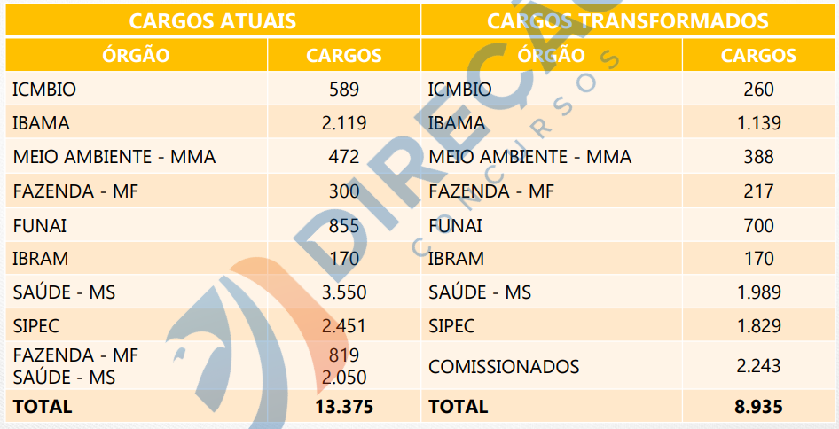 De acordo com a Medida Provisória assinada pelo presidente Lula, a mudança abrange 10.506 cargos efetivos de nível médio vagos. Esse total será convertido em 6.692 cargos de nível superior. Veja tabela abaixo!
