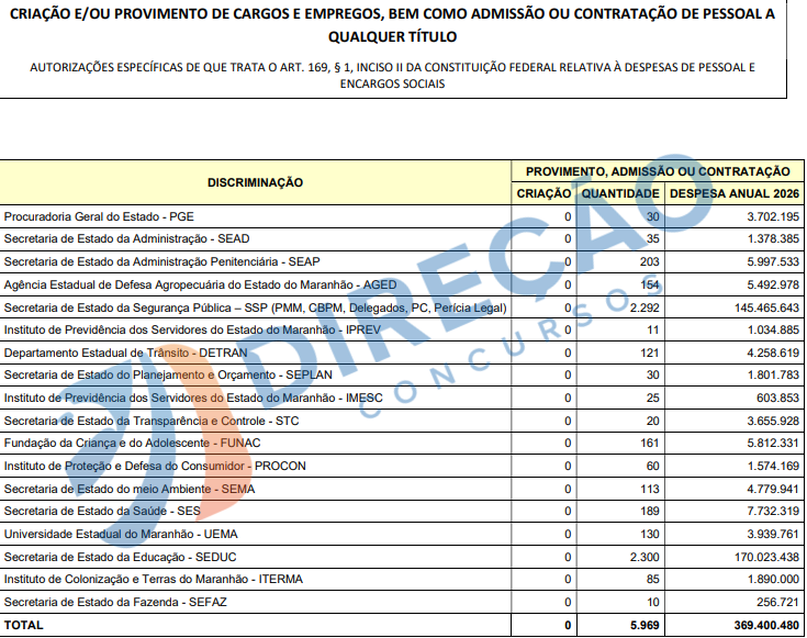 O Projeto de Lei Orçamentária Anual (PLOA) 2026 do Governo do Estado do Maranhão (MA), enviado à Assembleia Legislativa, trouxe uma notícia animadora para os interessados em concursos no estado: a previsão de provimento e admissão de 5.969 servidores no próximo ano. A informação, detalhada no anexo de “Criação e/ou Provimento de Cargos”, indica uma movimentação significativa, mesmo sem a criação de novos cargos, focando no preenchimento de vagas já existentes.