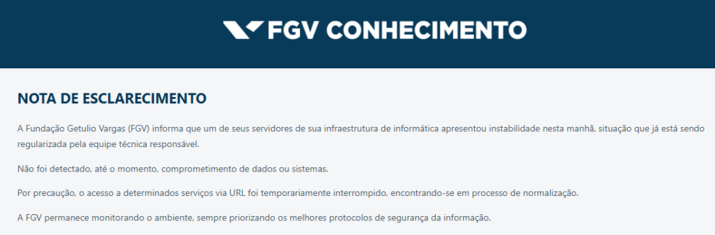 Segundo informações divulgadas pelo portal O Globo, todos os sistemas da FGV foram afetados pelo incidente. Parte deles já foi restabelecida, mas não há previsão oficial para a normalização completa da infraestrutura tecnológica da fundação.